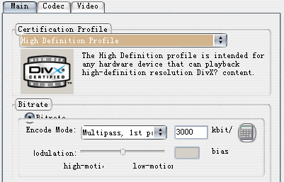 configuration window of DivX codec. 2-pass encoding